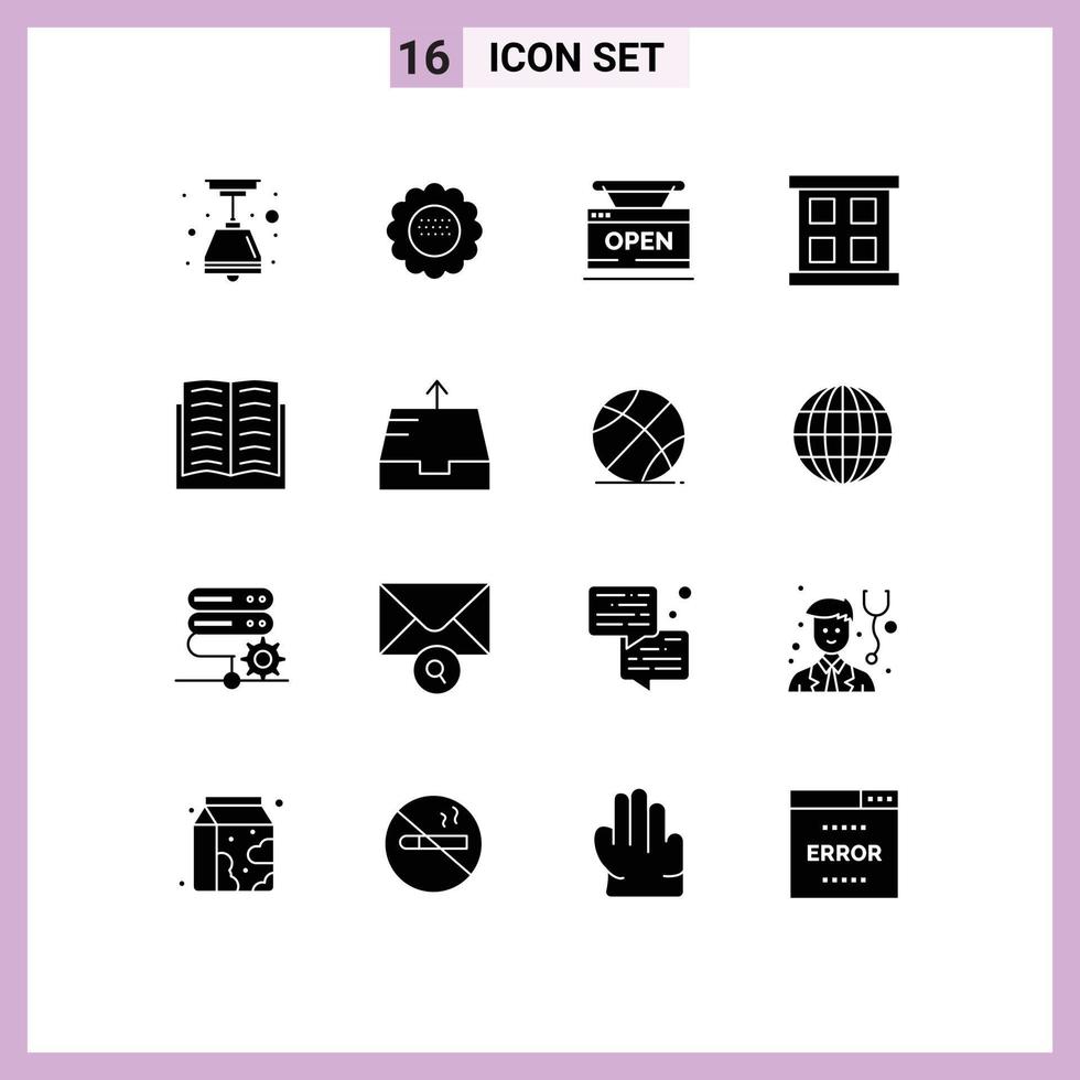 Mobile Interface Solid Glyph Set of 16 Pictograms of book window case open window online Editable Vector Design Elements