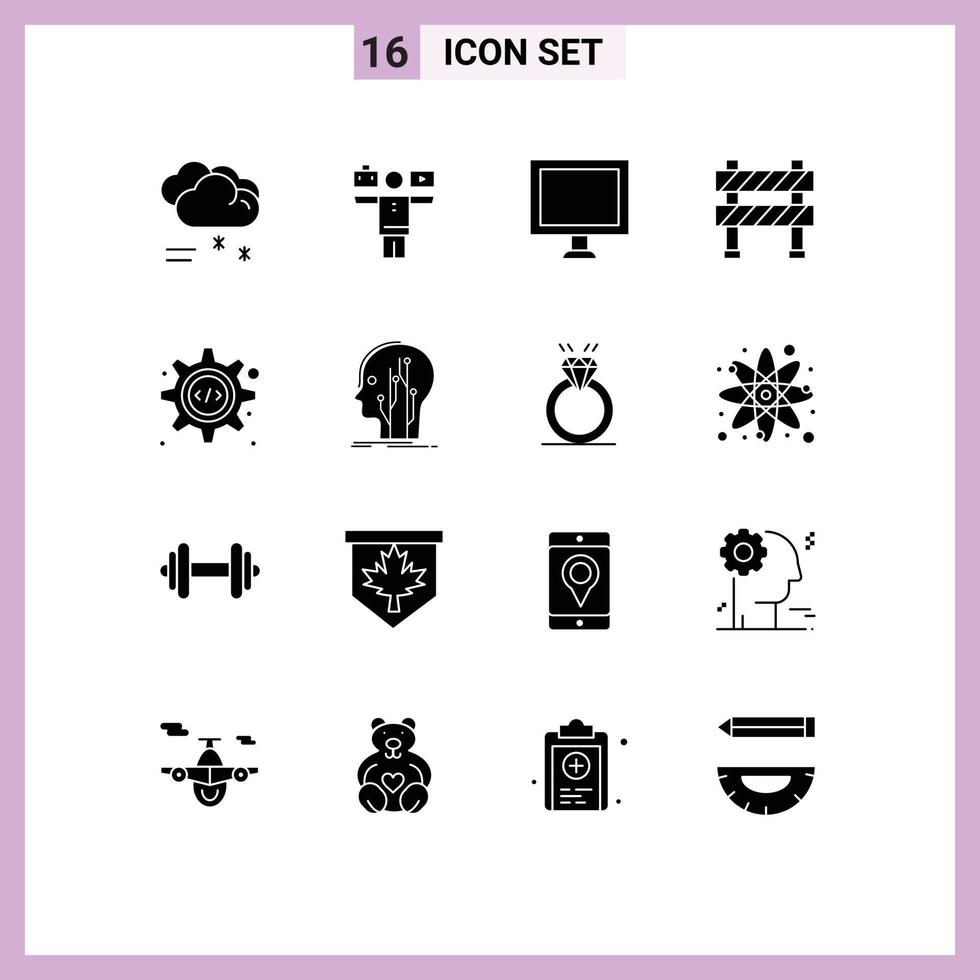 Pack of 16 creative Solid Glyphs of programming interface under construction computer road sign boundary Editable Vector Design Elements