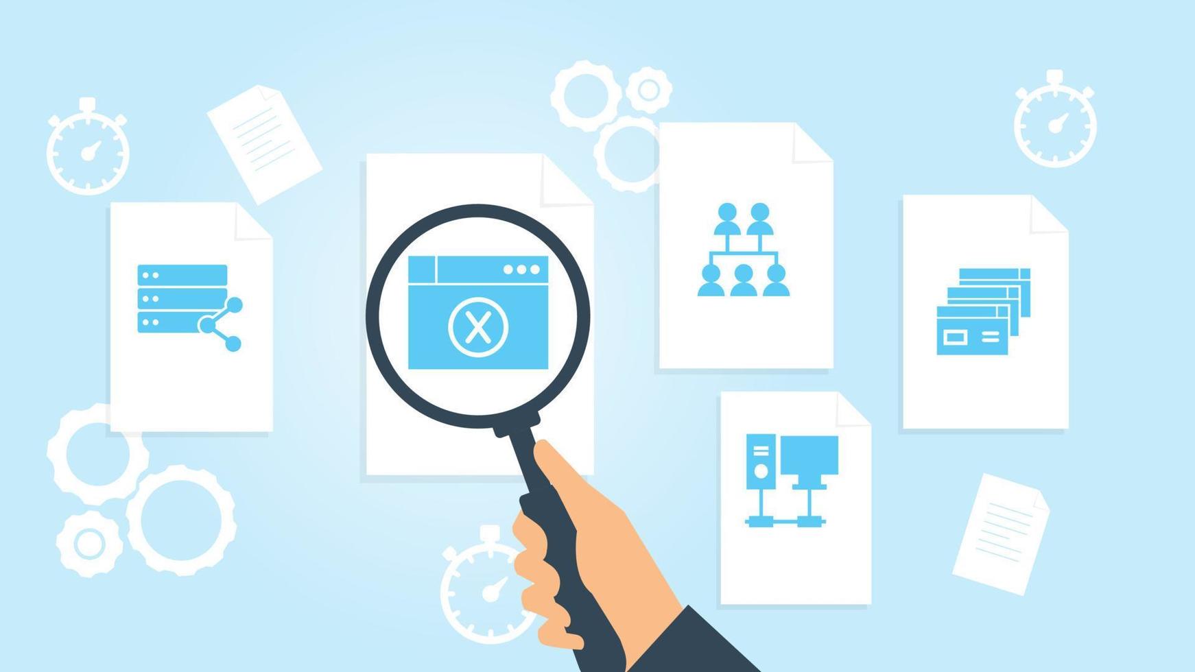 Database, server, brewers file, document research vector illustration. Document with search icons. File and magnifying glass. Analytics research sign. Vector Illustration on white background Pro Vector and Pro SVG