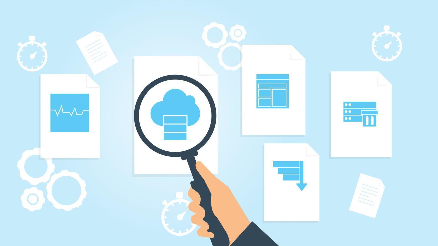 Database, server, storage file, document research vector illustration. Document with search icons. File and magnifying glass. Analytics research sign. Vector Illustration on white background Pro Vector and Pro SVG