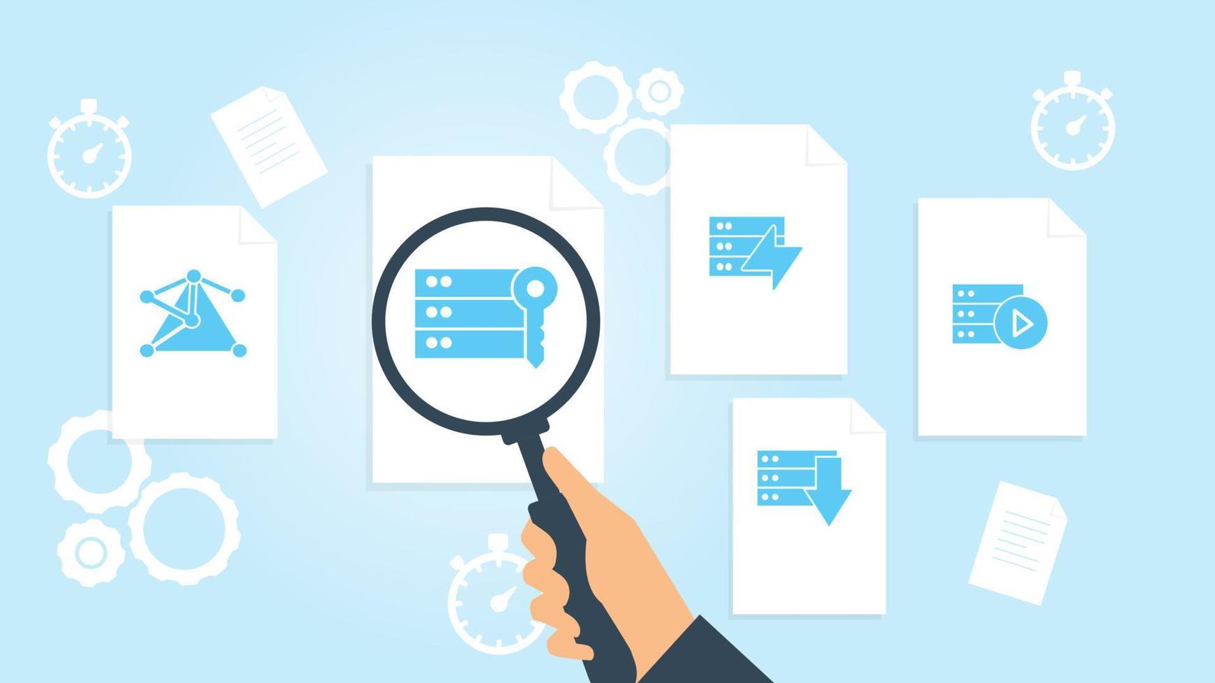 Database, server, play file, document research vector illustration. Document with search icons. File and magnifying glass. Analytics research sign. Vector Illustration on white background Pro Vector and Pro SVG