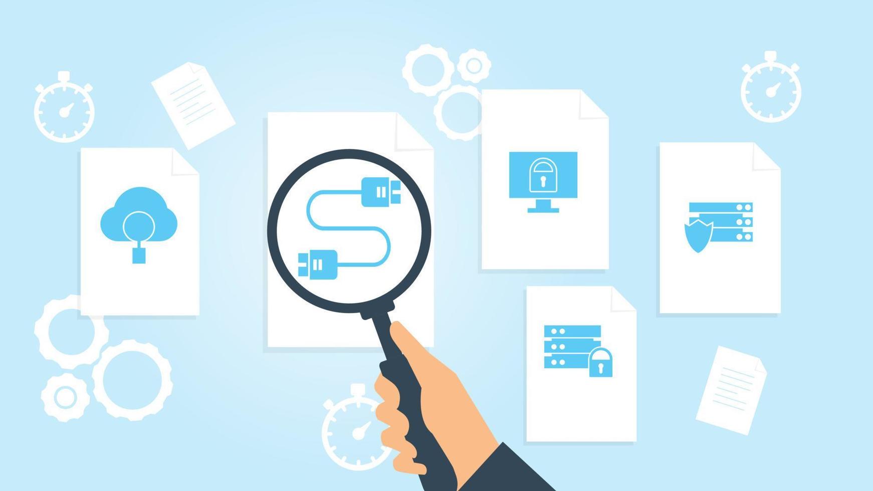 Database, server, shield file, document research vector illustration. Document with search icons. File and magnifying glass. Analytics research sign. Vector Illustration on white background Pro Vector and Pro SVG