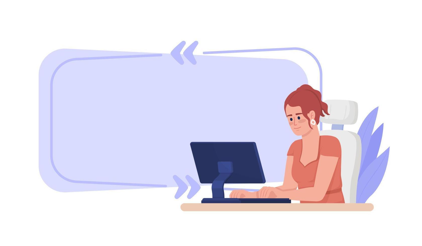 Remote employee quote textbox with flat character. Computer worker. Female typing. Speech bubble with editable cartoon illustration. Creative quotation isolated on white background Pro Vector