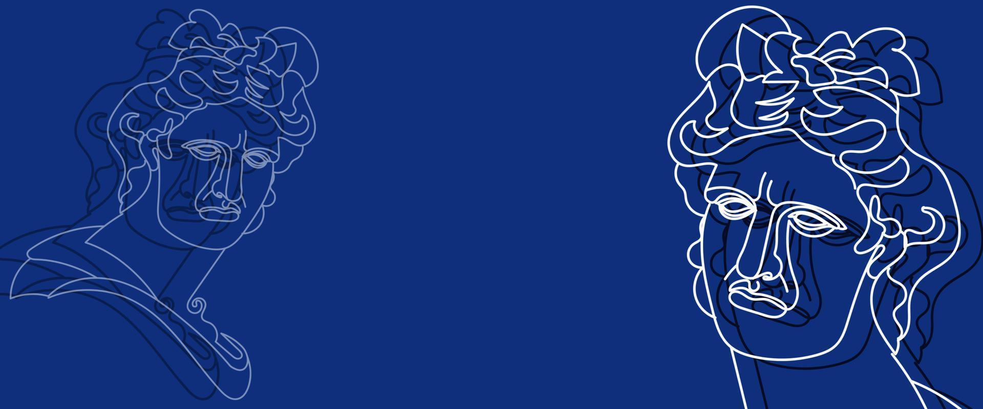 Apollo Belvedere's head in outline and abstract background. A rave set of psychedelic acid in style. Outline on a blue background. Abstract spots. Sculpture, figure, form of historical mythological Pro Vector