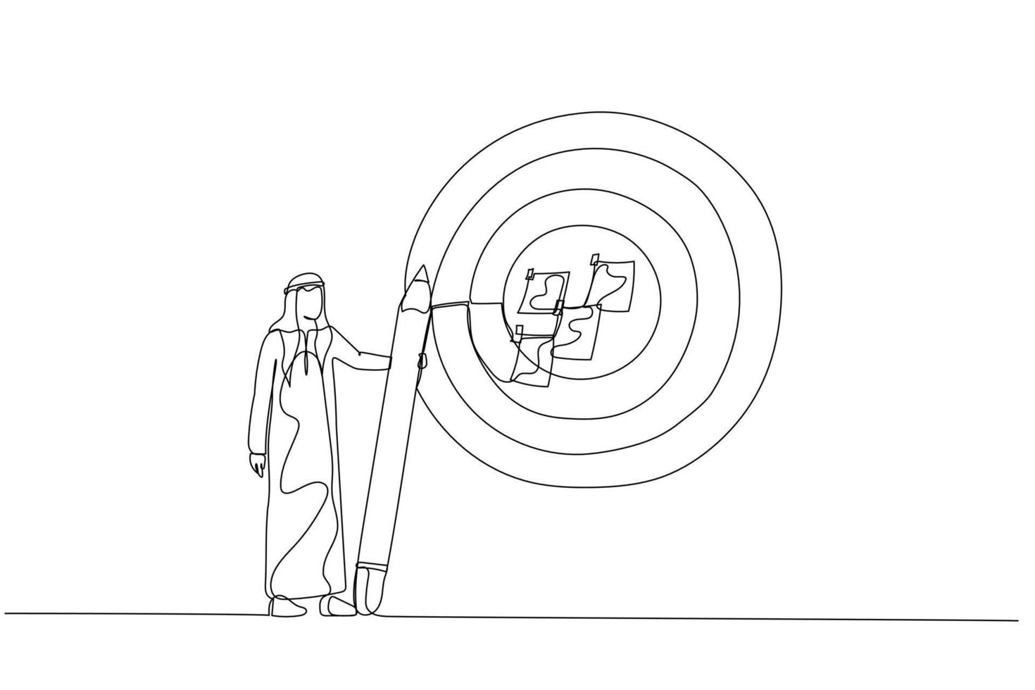 Illustration of businesswoman write down goal on notes and put on big dartboard concept of target setting. Single continuous line art style Pro Vector