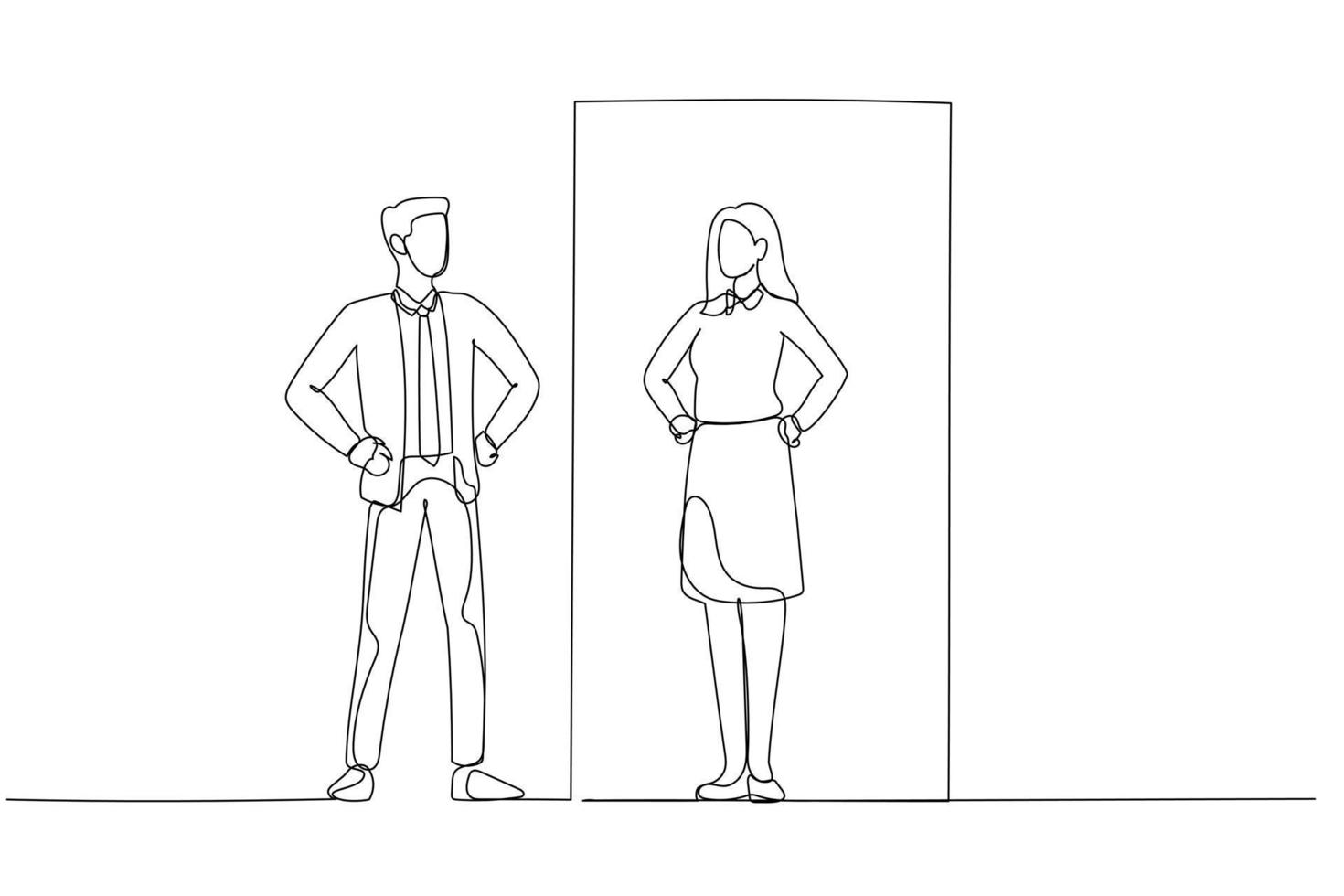 Drawing of businessman looking at opposite gender of self on mirror reflection. Single continuous line art style Pro Vector