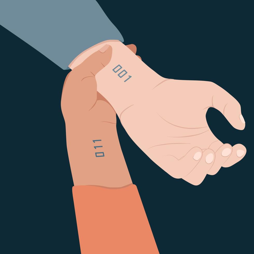 Two hands tattooed with numbers or indexes on wrist. The hand with the code mark eleven holds and, as it were, opens the wrist of the other hand with the code one. Chipping and control people concept. Pro Vector