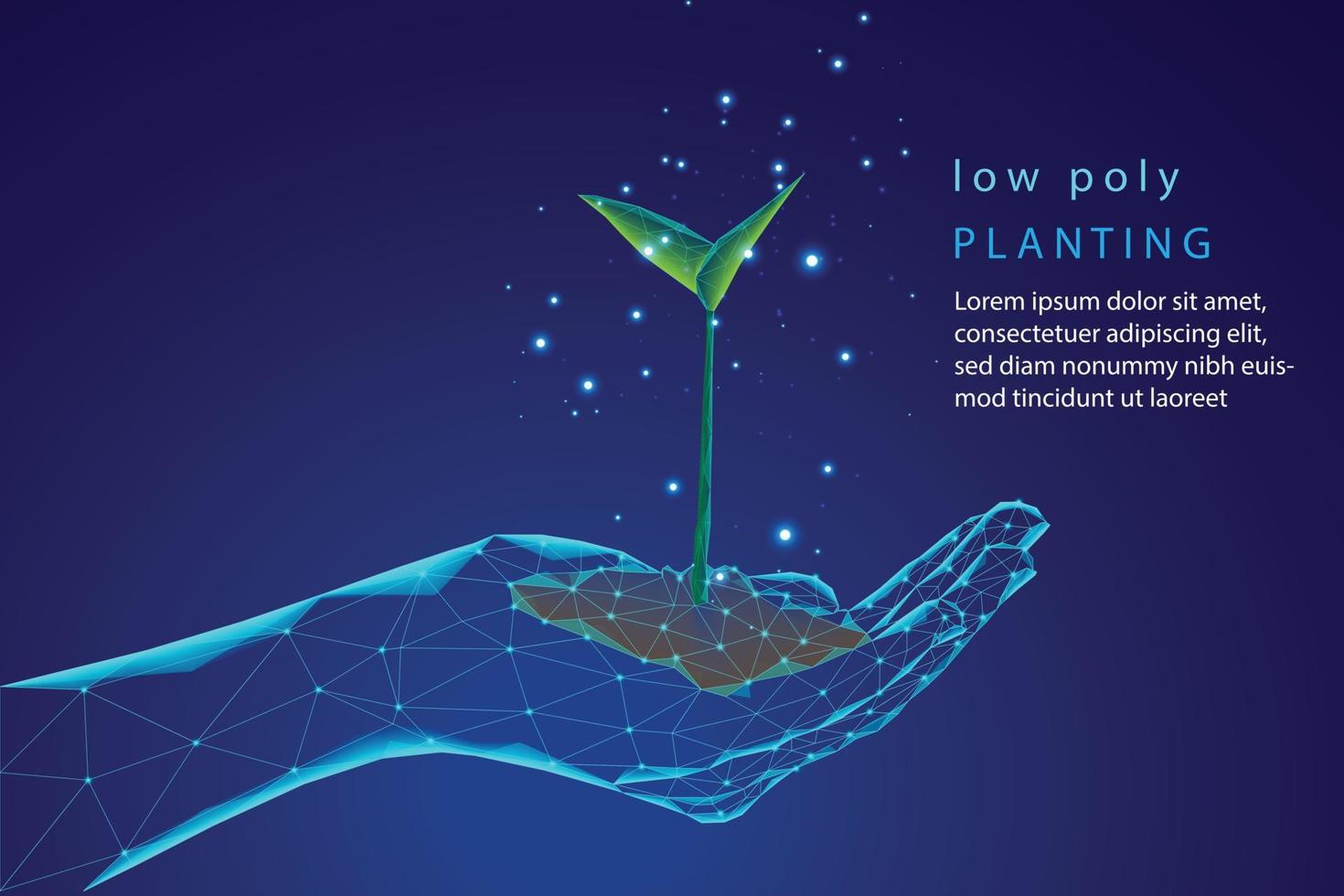 Abstract hand giving small plants in the soil, low poly pattern, blue geometric background design, connection structure, wireframe pattern. Pro Vector