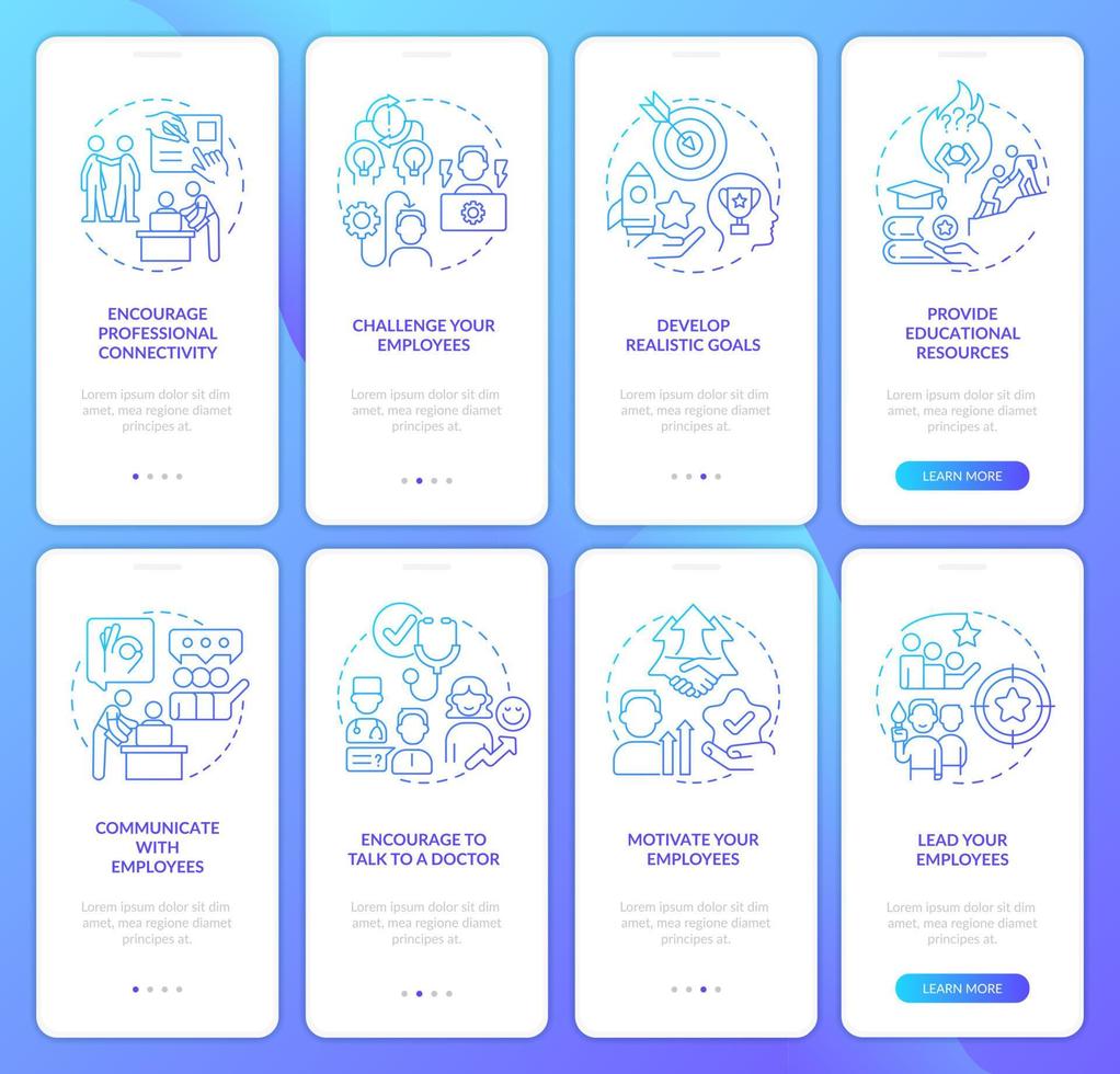 Mental health at workplace blue gradient onboarding mobile app screen set. Walkthrough 4 steps graphic instructions with linear concepts. UI, UX, GUI template Pro Vector