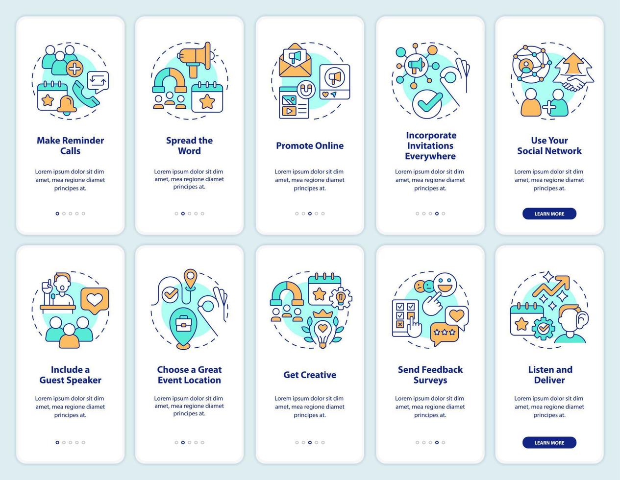 Increasing meeting attendance onboarding mobile app screen set. Walkthrough 5 steps editable graphic instructions with linear concepts. UI, UX, GUI template Pro Vector