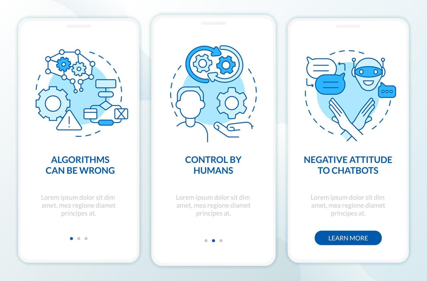 Cons of AI marketing blue onboarding mobile app screen. Problems walkthrough 3 steps editable graphic instructions with linear concepts. UI, UX, GUI template Pro Vector