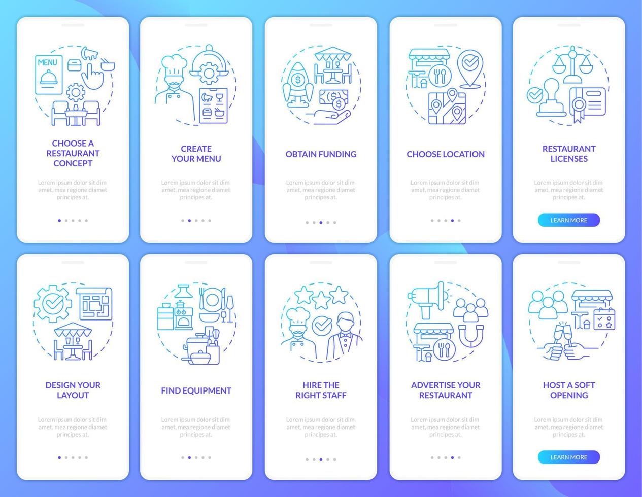 Choosing restaurant ideas blue gradient onboarding mobile app screen set. Walkthrough 5 steps graphic instructions with linear concepts. UI, UX, GUI template Pro Vector