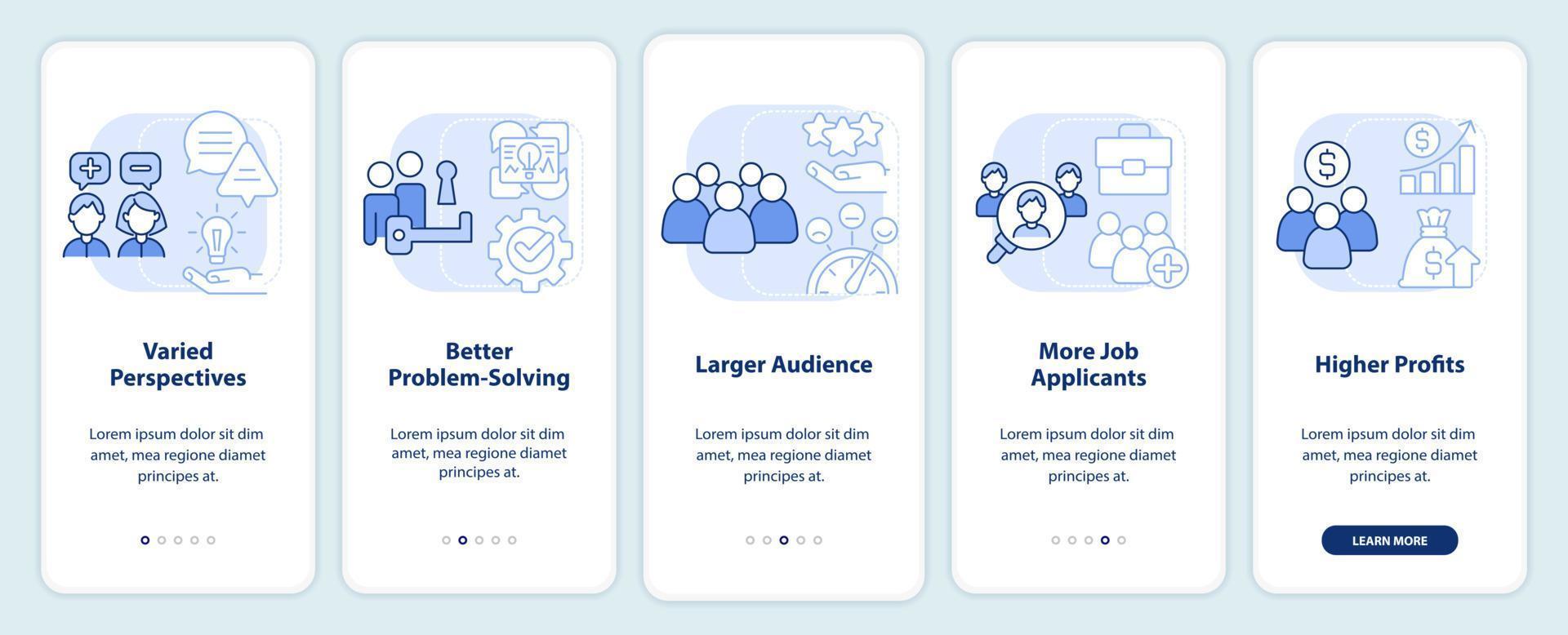 Workplace diversity benefits light blue onboarding mobile app screen. Walkthrough 5 steps editable graphic instructions with linear concepts. UI, UX, GUI template Pro Vector