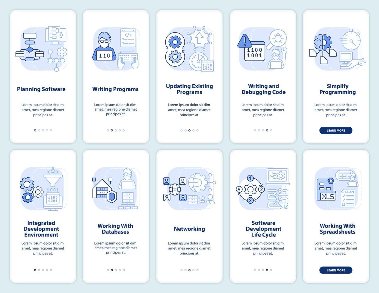 Professional programmer skills light blue onboarding mobile app screen set. Walkthrough 5 steps graphic instructions with linear concepts. UI, UX, GUI template Pro Vector