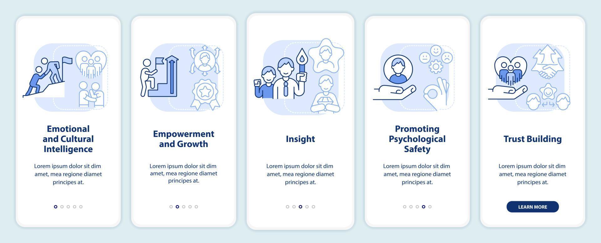 Traits of inclusive leaders light blue onboarding mobile app screen. Walkthrough 5 steps editable graphic instructions with linear concepts. UI, UX, GUI template Pro Vector