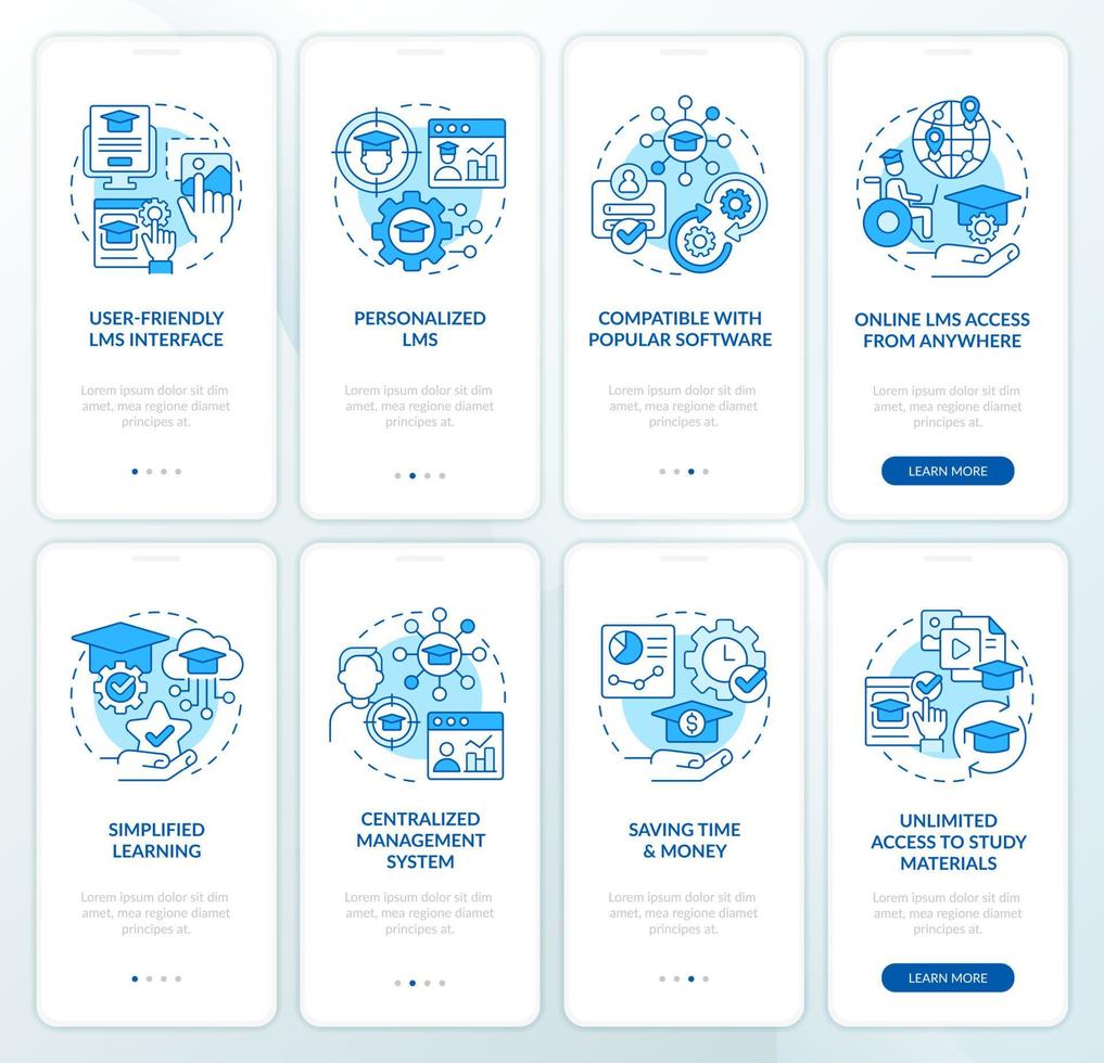 Learning management system blue onboarding mobile app screen. Walkthrough 4 steps editable graphic instructions with linear concepts. UI, UX, GUI template Pro Vector