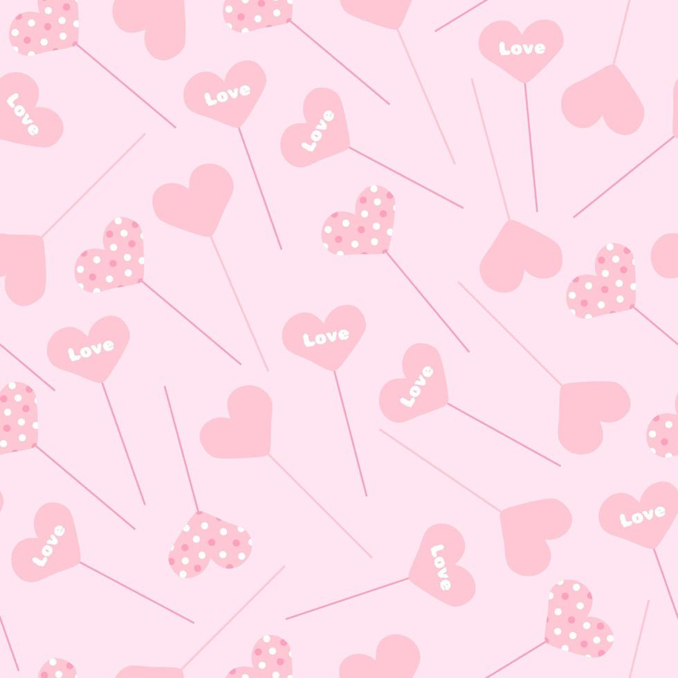 Seamless pattern with heart-shaped toppers with different patterns randomly scattered on a pink background in vector
