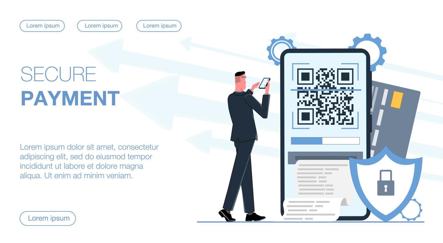 a businessman makes a secure payment from his phone using a card and a QR code flat vector illustration Pro Vector