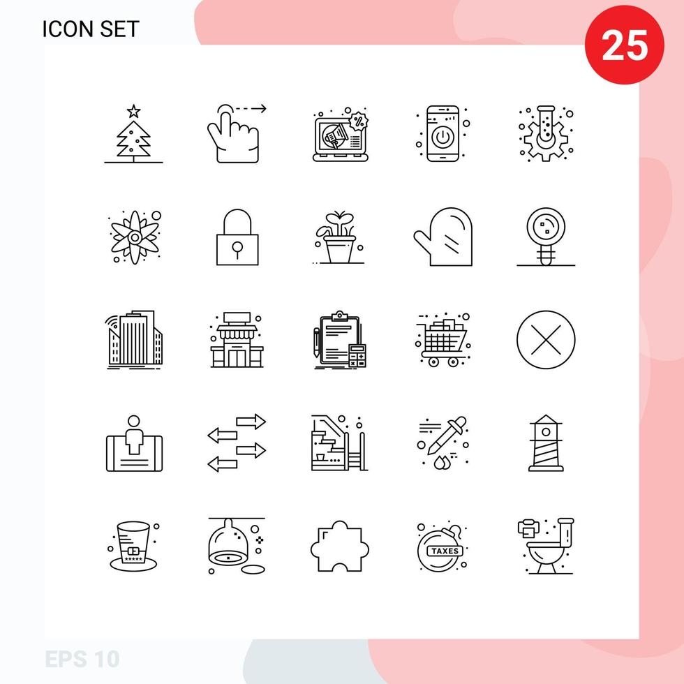 Mobile Interface Line Set of 25 Pictograms of tube flask marketing cog turn off Editable Vector Design Elements