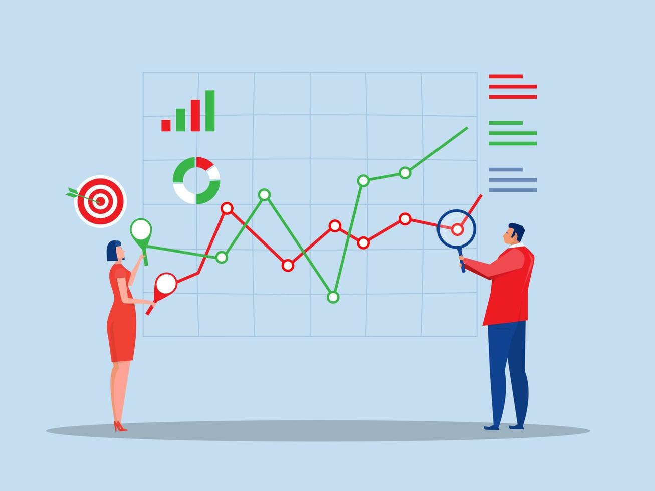 Business people using magnifier and optimize tools to Data analytics graph and chart dashboard finance report investment vector illustrator. Pro Vector