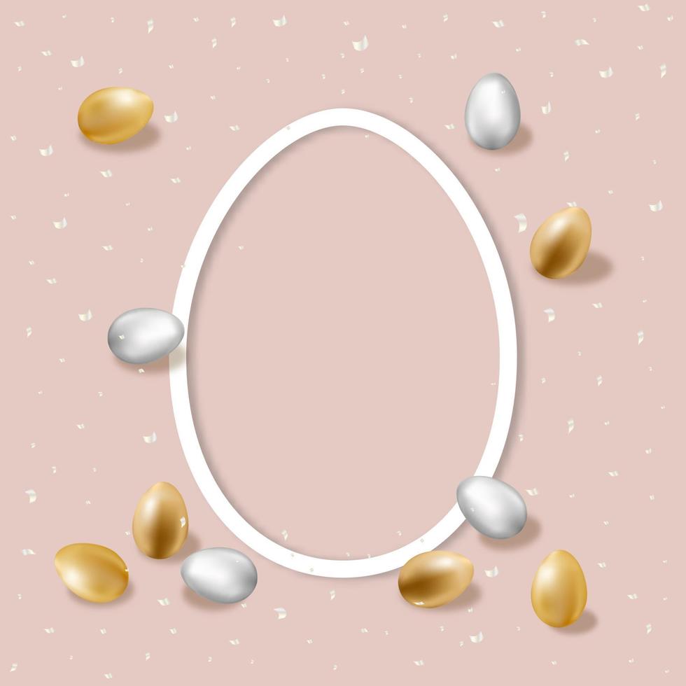Easter background with Gold Eggs decoration,Top view Design Template with 3d Silver Easter Eggs and White frame on Pink Background, Vector flat lay composition with copy space for text Pro Vector