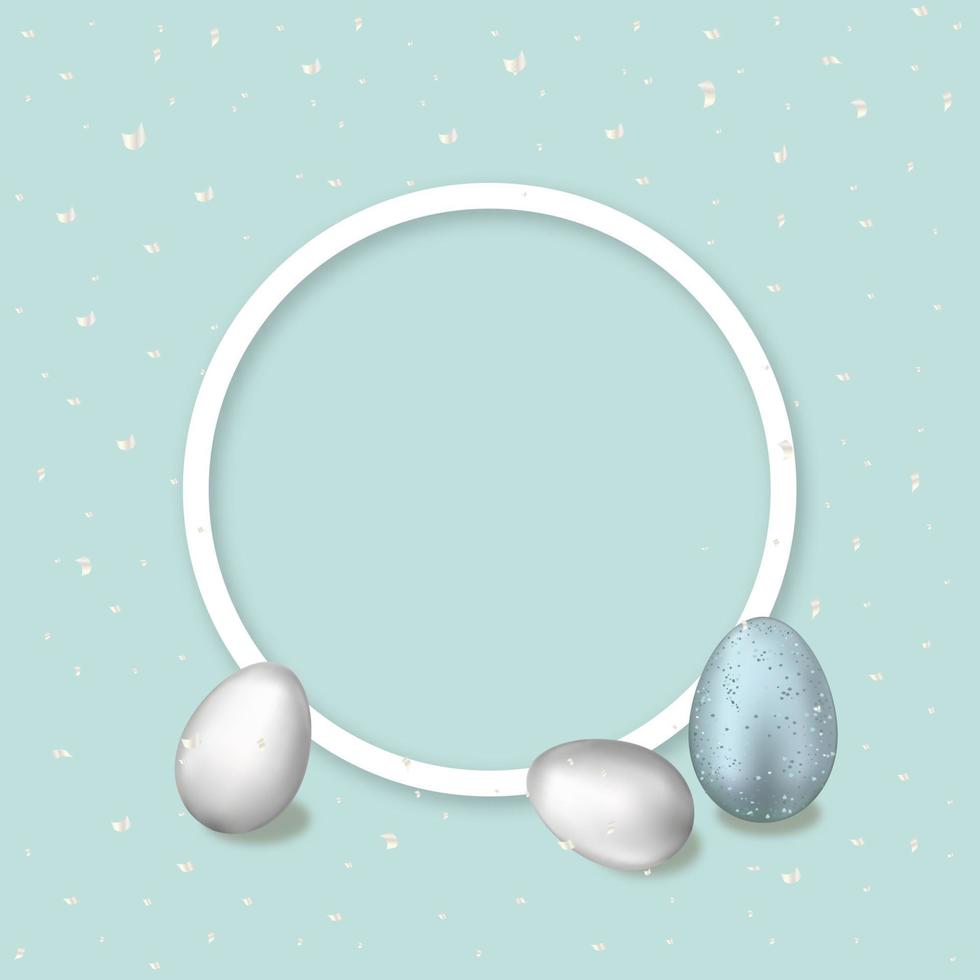 Easter background with Blue Eggs decoration,Top view Design Template with 3d Silver Easter Eggs and White frame on Blue Background, Vector flat lay composition with copy space for text Pro Vector