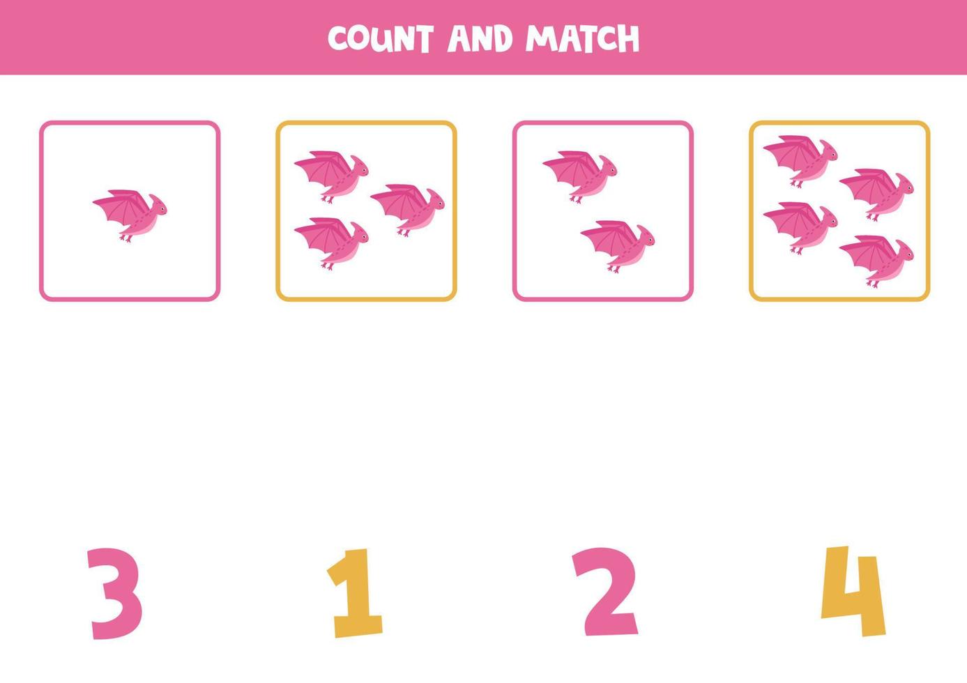 Counting game for kids. Count all pterodactyls and match with numbers. Worksheet for children. Pro Vector