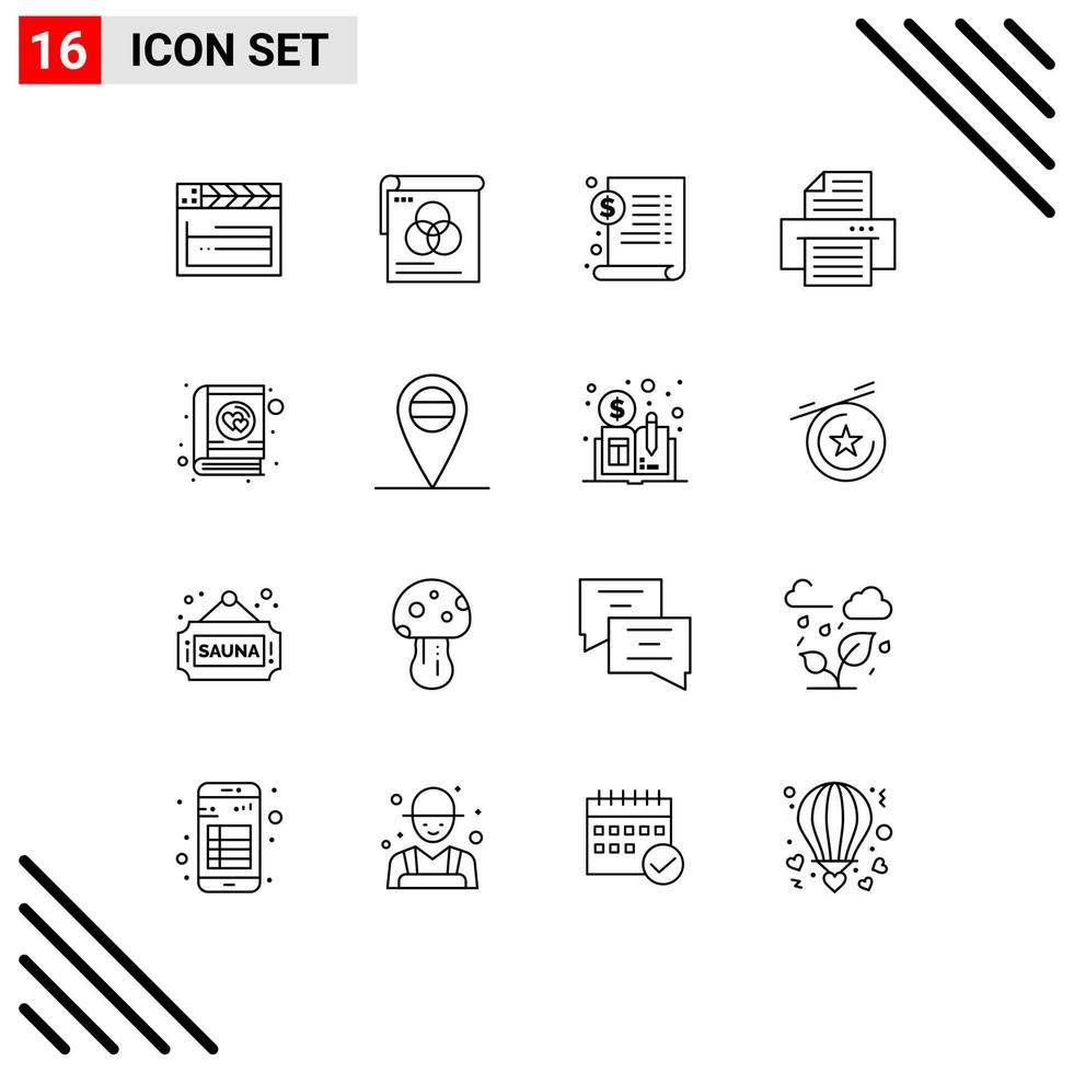 Mobile Interface Outline Set of 16 Pictograms of romantic book document printer device Editable Vector Design Elements
