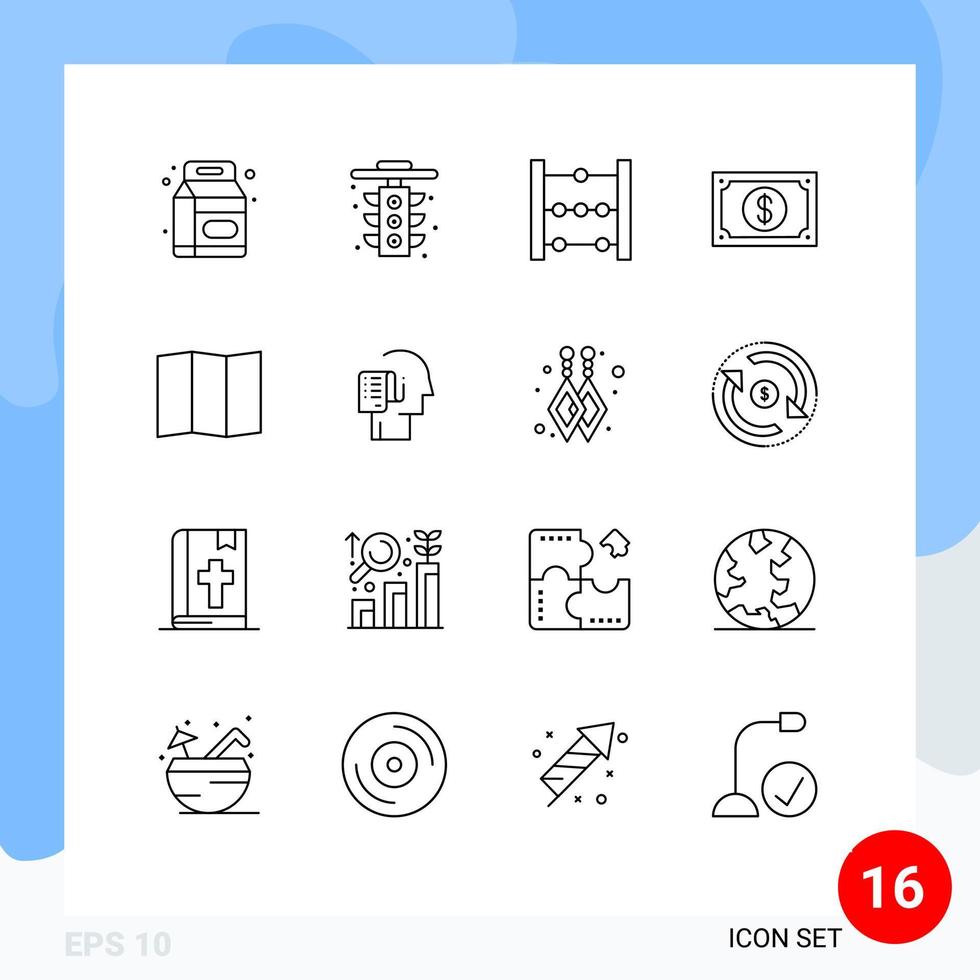 16 Universal Outlines Set for Web and Mobile Applications map wearable abacus watch money Editable Vector Design Elements