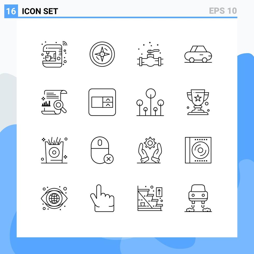 16 User Interface Outline Pack of modern Signs and Symbols of search content mechanical chart car Editable Vector Design Elements