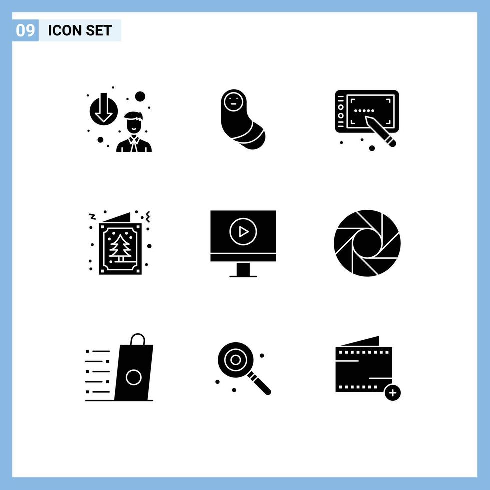 Pack of 9 Modern Solid Glyphs Signs and Symbols for Web Print Media such as camera player stylus display christmas Editable Vector Design Elements
