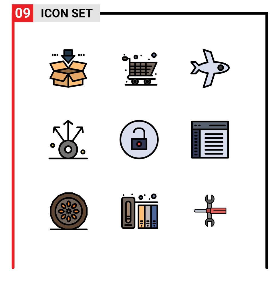 Set of 9 Modern UI Icons Symbols Signs for coding multimedia plane media player unlock Editable Vector Design Elements