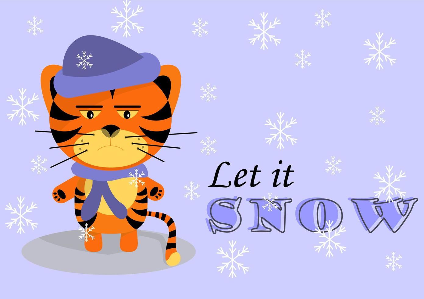 Grumpy tiger cub with text let is snow on snowy background Pro Vector