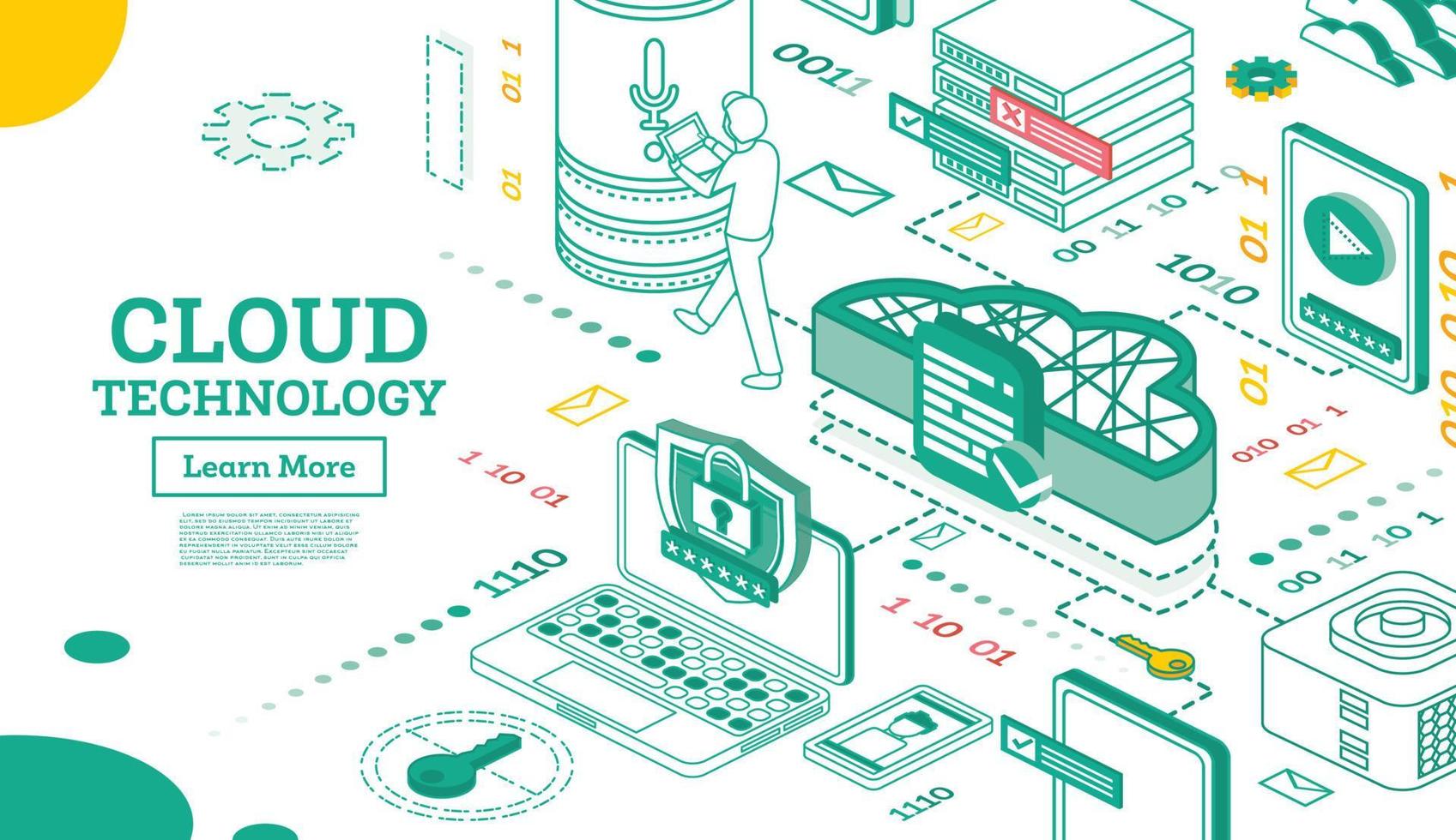 Outline Isometric Cloud Technology Networking Concept. Pro Vector