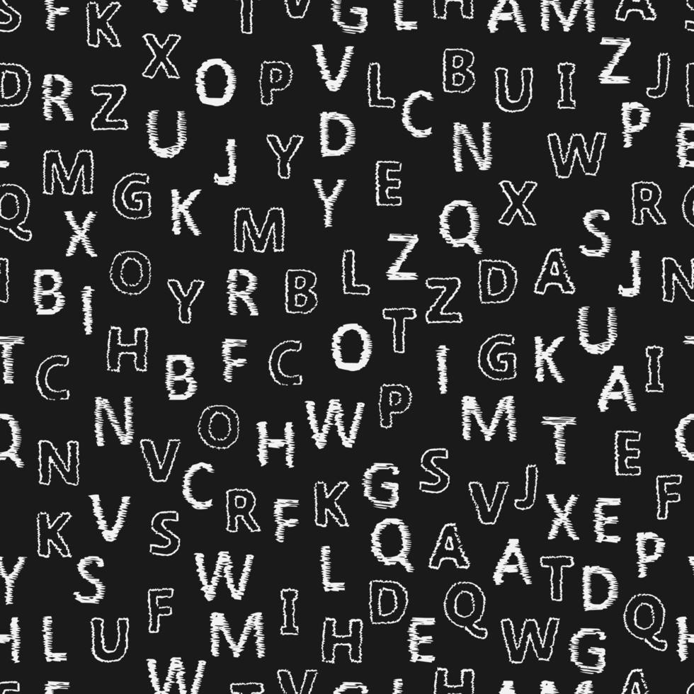 Doodle alphabet seamless background. Endless vector pattern with white letters on a black background. Pro Vector