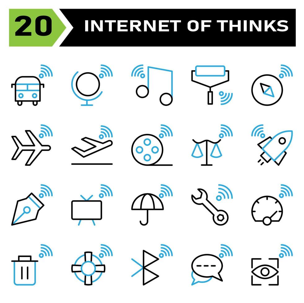 Internet of things icon set include bus, internet of things, globe, world, music, tone, roller, paint, compass, navigation, plane, airplane, takeoff, film roll, movie, scales, balance, rocket vector
