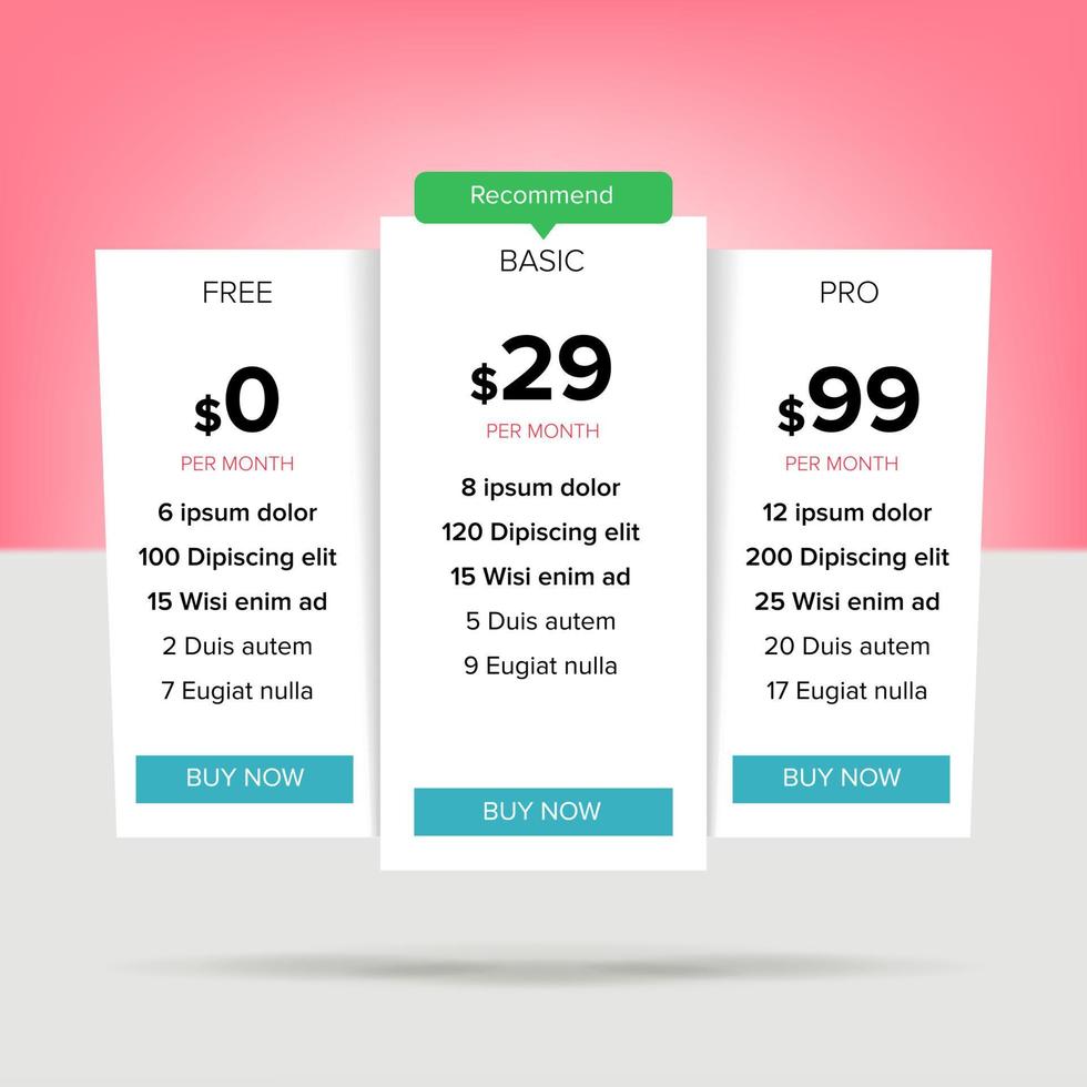 Pricing Business Plans Vector. Collection Of Pricing Plans For Websites And Applications. Hosting Table Banner. Pro Vector