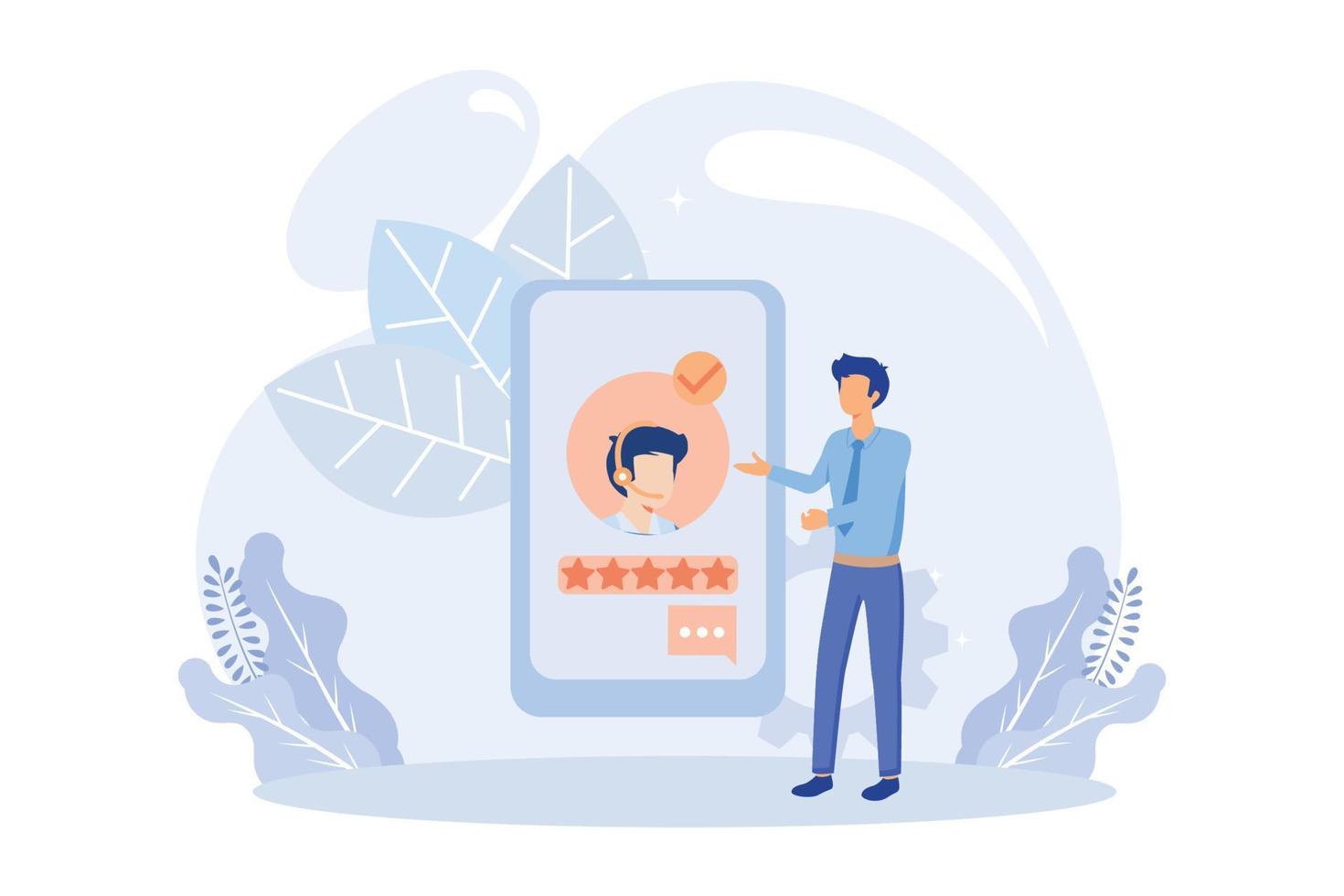 Customer feedback and user experience illustration. Characters giving review to customer service operator and choosing emoji to show satisfaction rating. Rating scale concept. Flat vector illustration Pro Vector