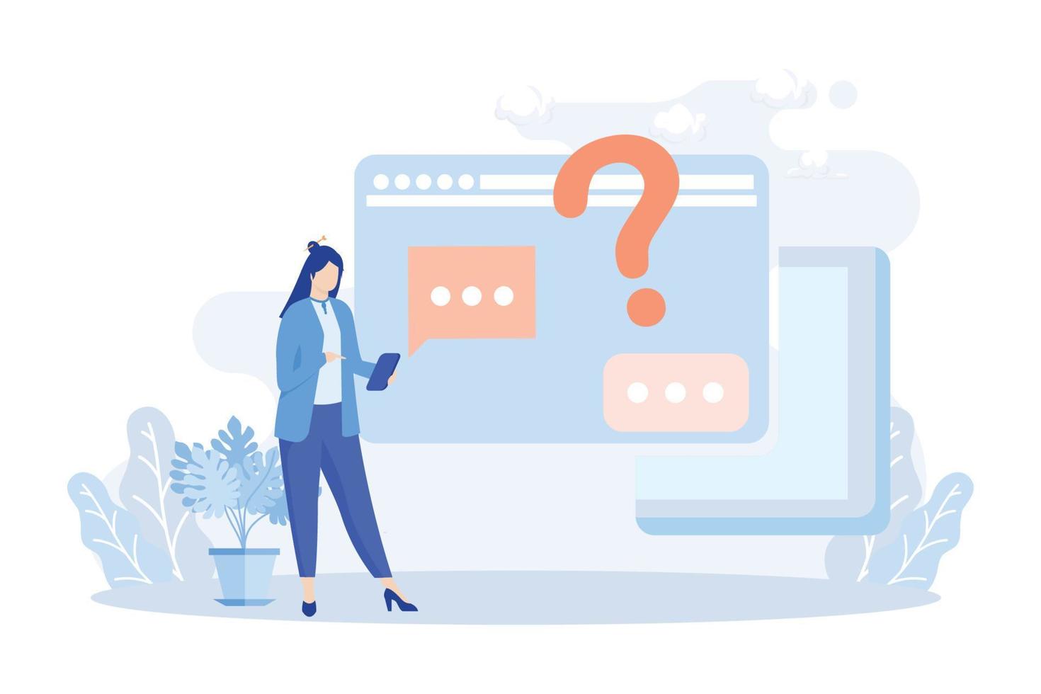 Customer support illustration. Characters using online helpdesk platform. People asking a questions and receiving answers from helpdesk or call center operator. Flat vector modern illustration Pro Vector