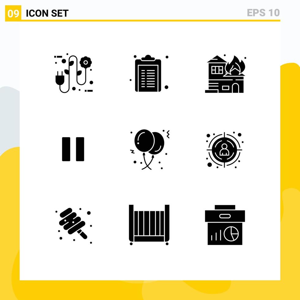 Group of 9 Solid Glyphs Signs and Symbols for balloon vedio architecture pause control Editable Vector Design Elements