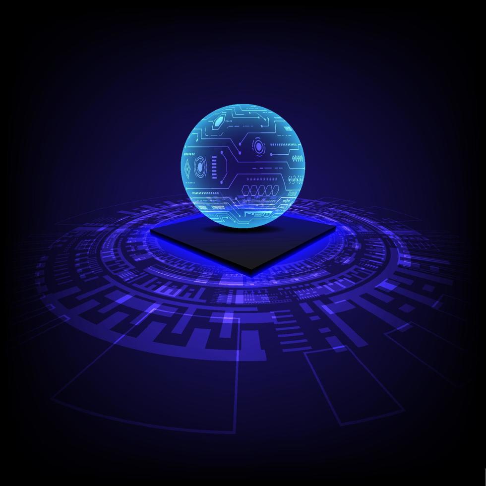 Background technology abstract electronic sphere floating above a 3D microchip glowing below The tech circle is at the bottom. on a blue gradient background Pro Vector