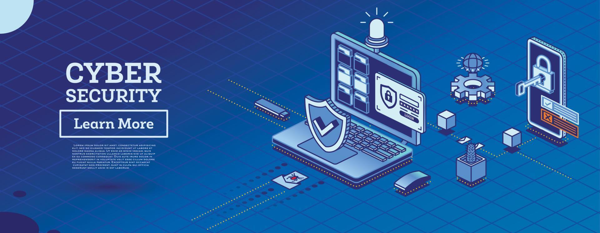 Cyber Security Concept. Shield Symbol. Isometric Laptop and Smartphone with Key Inserted in Lock. Pro Vector
