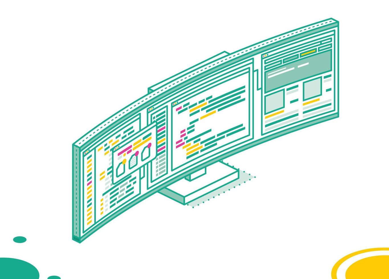 Isometric Curved Gaming Monitor with Open Web Pages and Folders. PC Computer Monoblock. Pro Vector