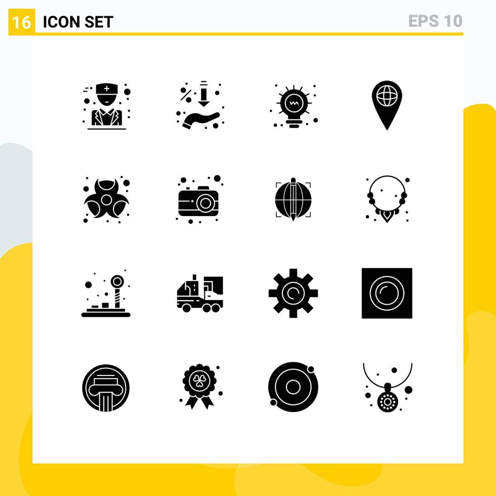 Pack of 16 Modern Solid Glyphs Signs and Symbols for Web Print Media such as hazardous biohazard web chemical globe Editable Vector Design Elements