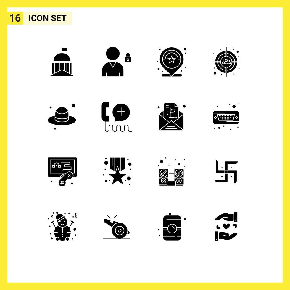 Mobile Interface Solid Glyph Set of 16 Pictograms of brim users location target stars Editable Vector Design Elements