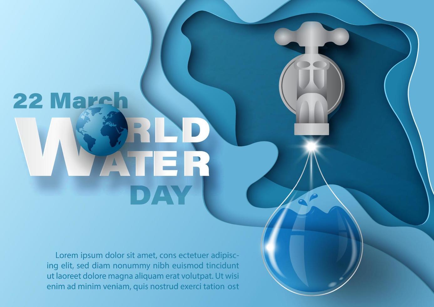 Front view of water tap with glass droplet, the day and name of event, example texts on blue layer of abstract shape in paper cut style and navy blue paper pattern background. Pro Vector