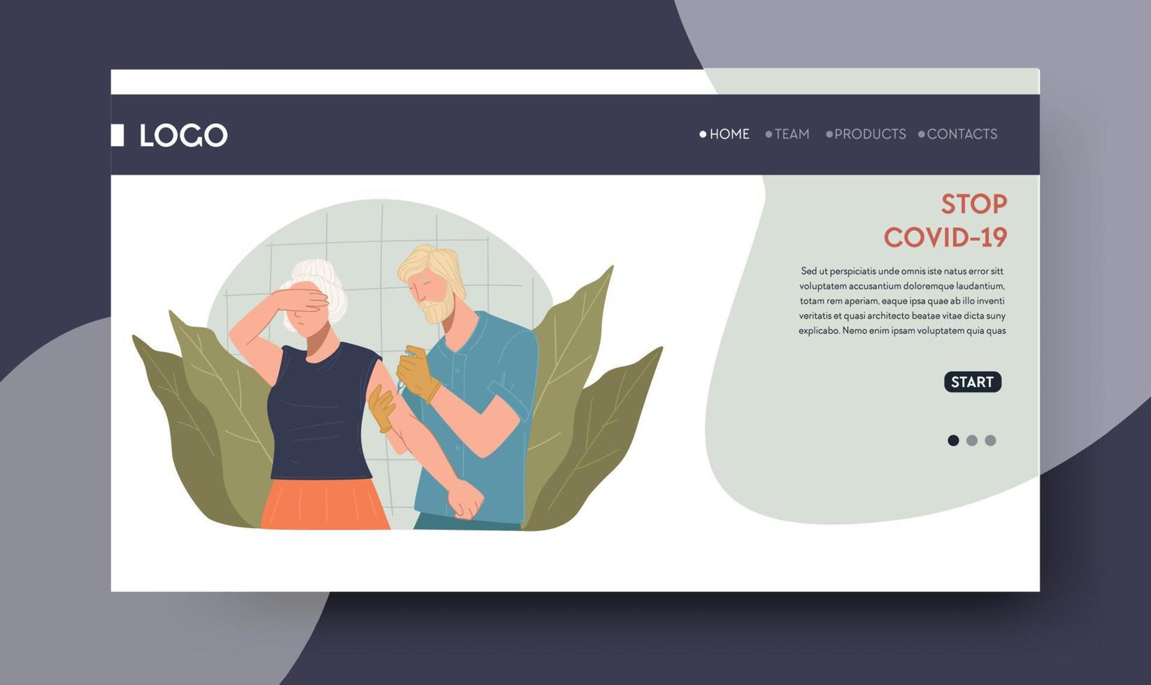 Stop covid 19, getting vaccine and protecting organism from viruses and diseases. Patient at clinics with doctor. Website or web landing page template with navigation buttons. Vector in flat style Pro Vector