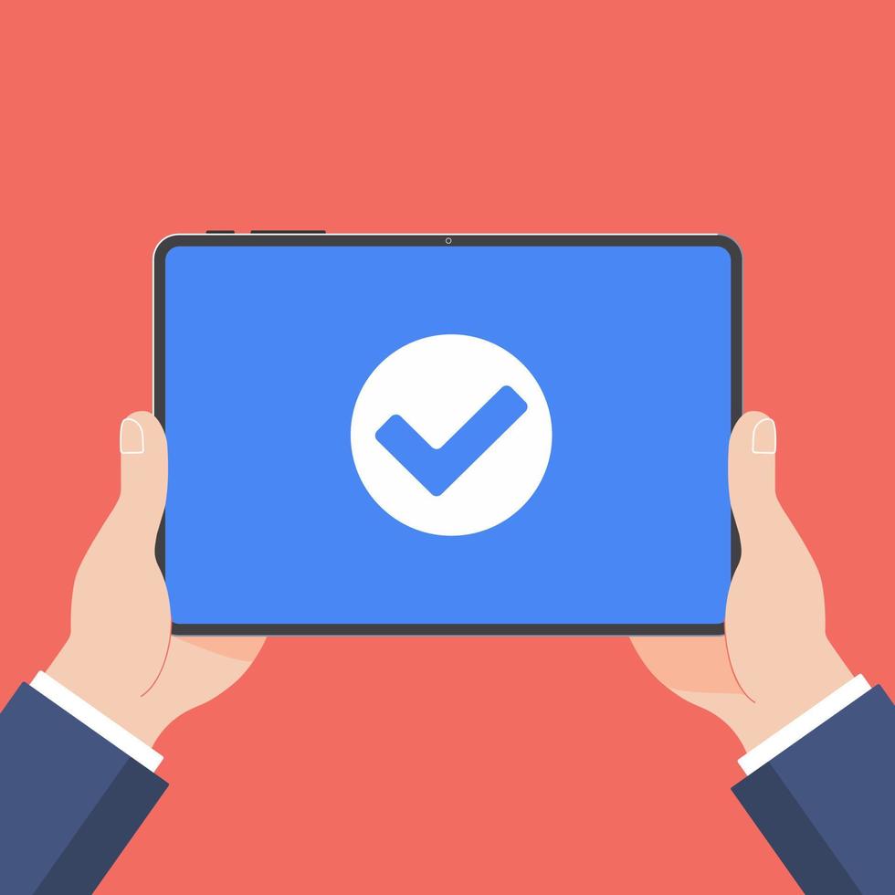 Hand holding black tablet computer PC device isolated on red background. Pad computer on human's hands with check mark tick OK in the circle flat design vector illustration Pro Vector