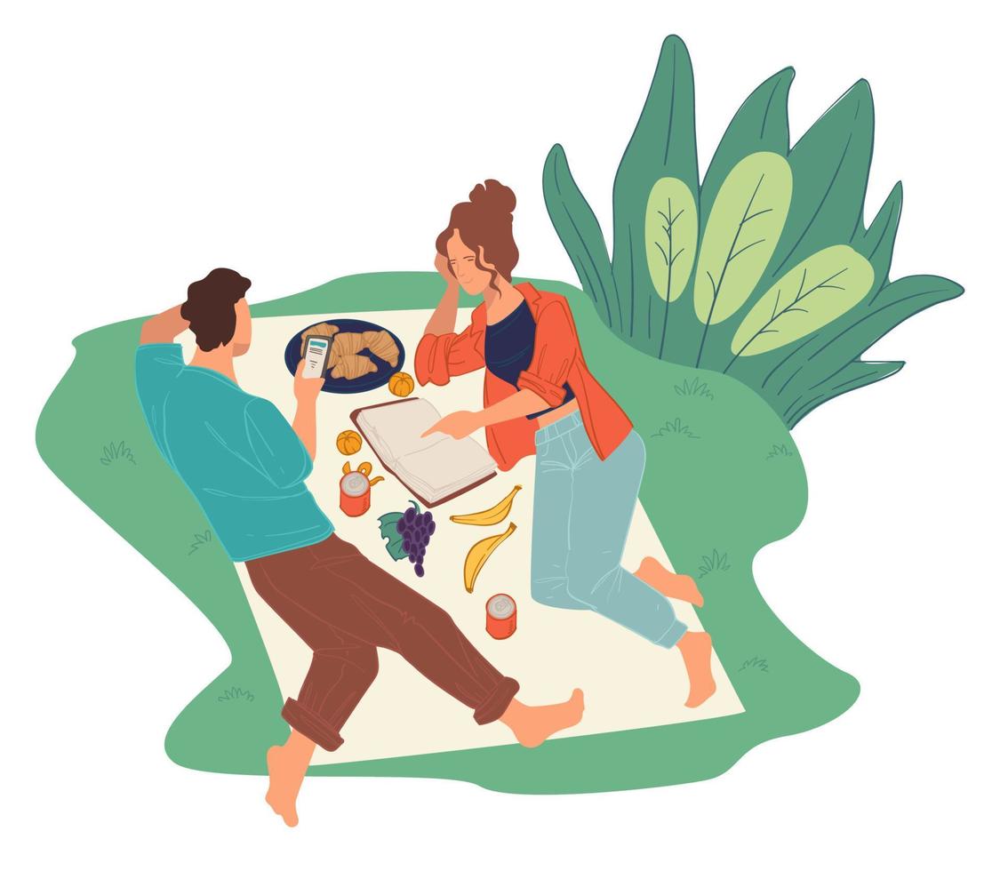 Couple on picnic reading book and browsing web Pro Vector