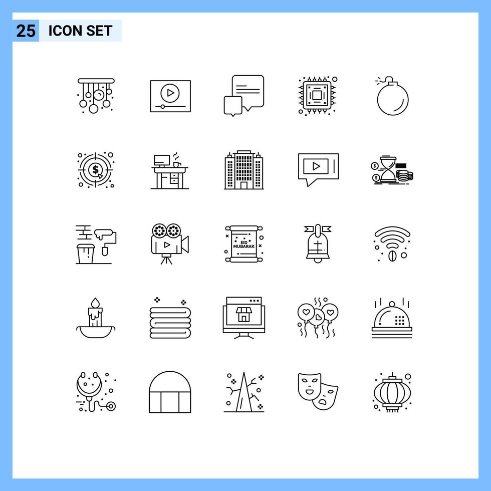 User Interface Pack of 25 Basic Lines of currency explosion conversation explosive microchip Editable Vector Design Elements